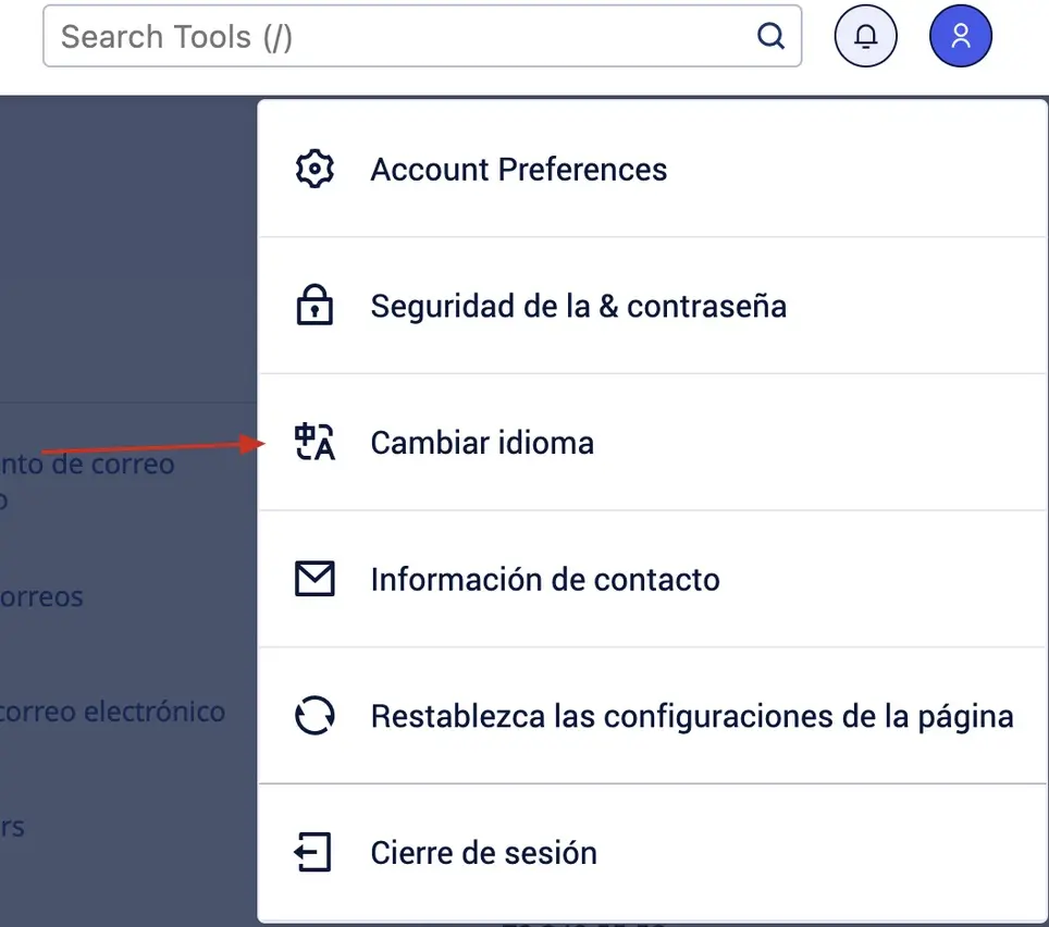 Se desplegarán diferentes opciones, elegimos la opción Cambiar idioma: